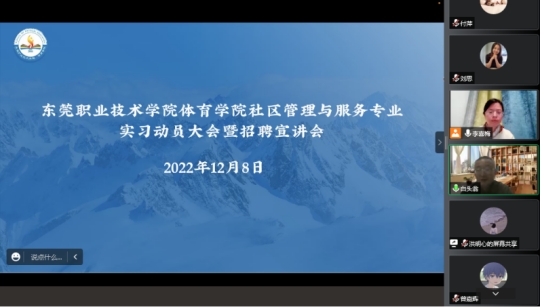 12月8日,体育学院社区管理与服务专业召开了实习动员暨招聘宣讲会。此次会议在线上举行,体育学院院长杨乃彤、专职副书记张楠、东莞市莞香花青少年服务中心、东莞市12345政务服务便民热线、鹏星、正阳、乐雅、大众社会工作服务中心等六家组织机构嘉宾、社区管理与服务专业全体教师及2023届毕业生参加了会议。