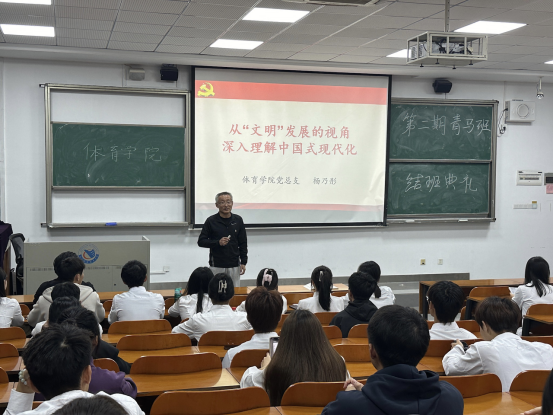 2023年11月16日晚,我校体育学院党总支书记、院长杨乃彤教授在教四203为体育学院第二期青年马克思主义者培养工程全体学员讲授了题为《从“文明”发展的视角深入理解中国式现代化》的思想政治理论第一课。