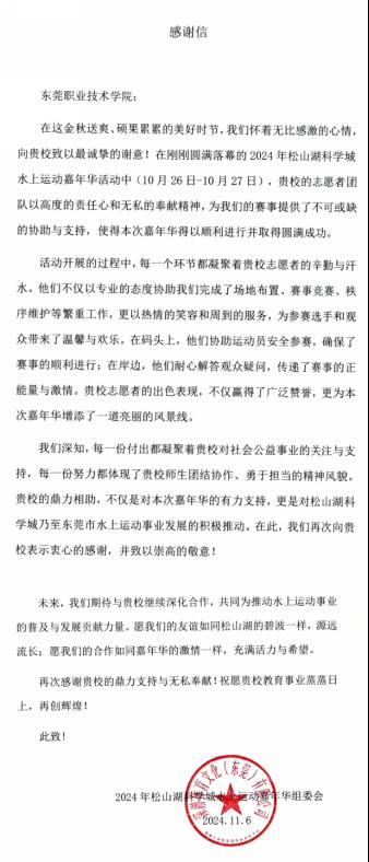 来自松山湖科学城水上嘉年华组委会的感谢信