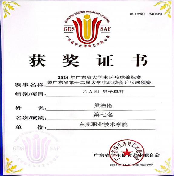 2024 年广东省大学生乒乓球锦标赛暨广东省第十二届大学生运动会乒乓球预赛于近日圆满落幕。我校体育学院社会体育专业的梁浩伦同学,在乙 A 组(体育专业组)男子单打比赛中表现出色,荣获第七名。这是我校体育专业首次参与乒乓球省级赛事,实现了历史性的突破。