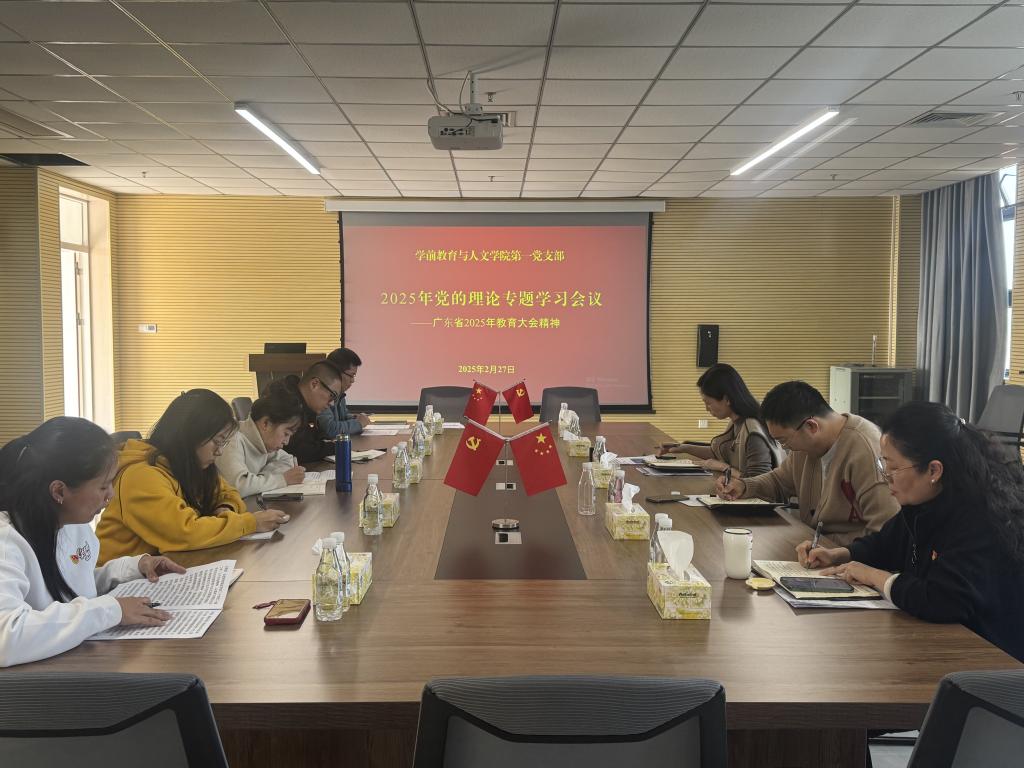 2025年2月24日上午,全省教育大会在广州召开。为深入学习贯彻习近平新时代中国特色社会主义思想,全面贯彻落实党的二十大和二十届二中、三中全会精神,认真学习贯彻习近平总书记在全国教育大会上的重要讲话精神,深入贯彻落实习近平总书记对广东系列重要讲话和重要指示精神,对新时代新征程加快推进广东教育现代化、建设教育强省进行再动员再部署再落实。2月27日下午,学前教育与人文学院第一党支部在人文艺术大楼908室围绕“全省教育大会精神”开展专题学习会。会议由第一党支部书记罗芳主持,全体党员教师参与。