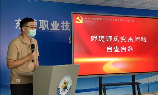 会上,党总支书记刘忠洋带领全体教职工学习《关于加强和改进新时代师德师风建设的意见》《新时代高校教师职业行为十项准则》等文件精神和师德师风建设“十不准”要求,并强调教师们要认清当前形势,夯实主体责任,严肃政治纪律,不触“底线”,不踩“红线”,远离“高压线”,努力加强自身的道德修养,以高标准严格要求自己;党总支副书记朱跃东通报了教育部公开曝光的第十二批5起违反教师职业行为十项准则负面典型案例;全体教师对照《师德突出问题排查情况汇总表》,查摆问题、填写清单,按要求存在的问题认真进行计划整改,做到依法施教。
