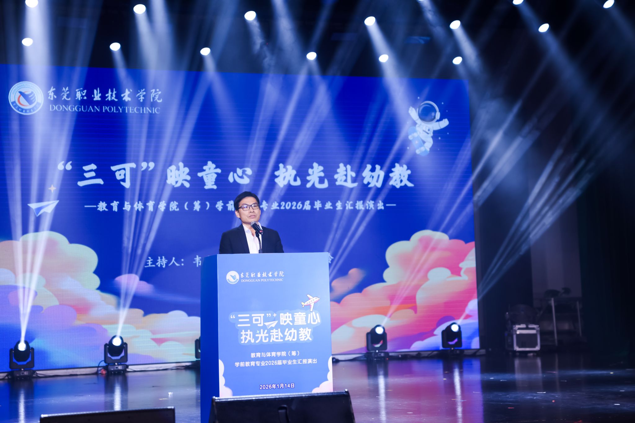 近日,东莞职业技术学院教育与体育学院(筹)以“三可映童心,执光赴幼教” 为主题的学前教育专业2026届毕业生汇报演出在梦想剧场温情启幕、圆满落幕。学校党委副书记、纪委书记蔡东宝,东莞市学前教育研训与评估中心多位园长代表,学校各部门中层领导莅临现场,与全体师生、家长以及东职院附属幼儿园小嘉宾们齐聚一堂,共同见证学子们三年寒窗磨砺后的成长蜕变与风采绽放。