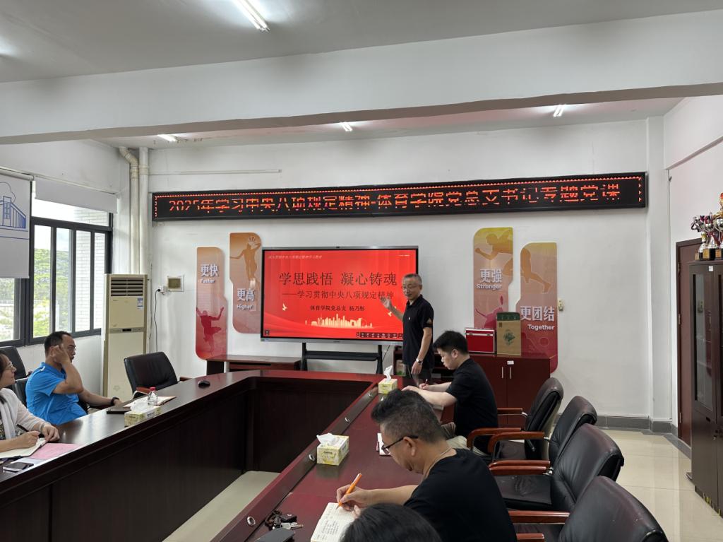 2025年5月20日上午,体育学院党总支书记杨乃彤以“深入贯彻中央八项规定精神学习教育”为主题,为全院党员师生讲授专题党课。