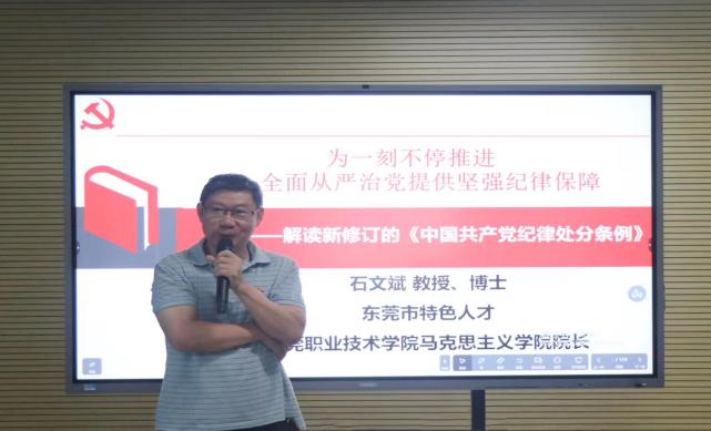 讲座邀请了马克思主义学院党总支副书记、院长石文斌教授作《为一刻不停推进全面从严治党提供坚强纪律保障》专题报告。石教授从“条例修订的历史沿革”“新修订条例的主要内容和重要意义”“贯彻执行条例的基本要求”三个方面,全面阐释了开展党纪学习教育的背景、目标和任务,深化对党规党纪的理解,引导党员领导干部进一步增强纪律观念、强化纪律自觉,并通过互动提问等方式引导大家积极思考、深入交流。