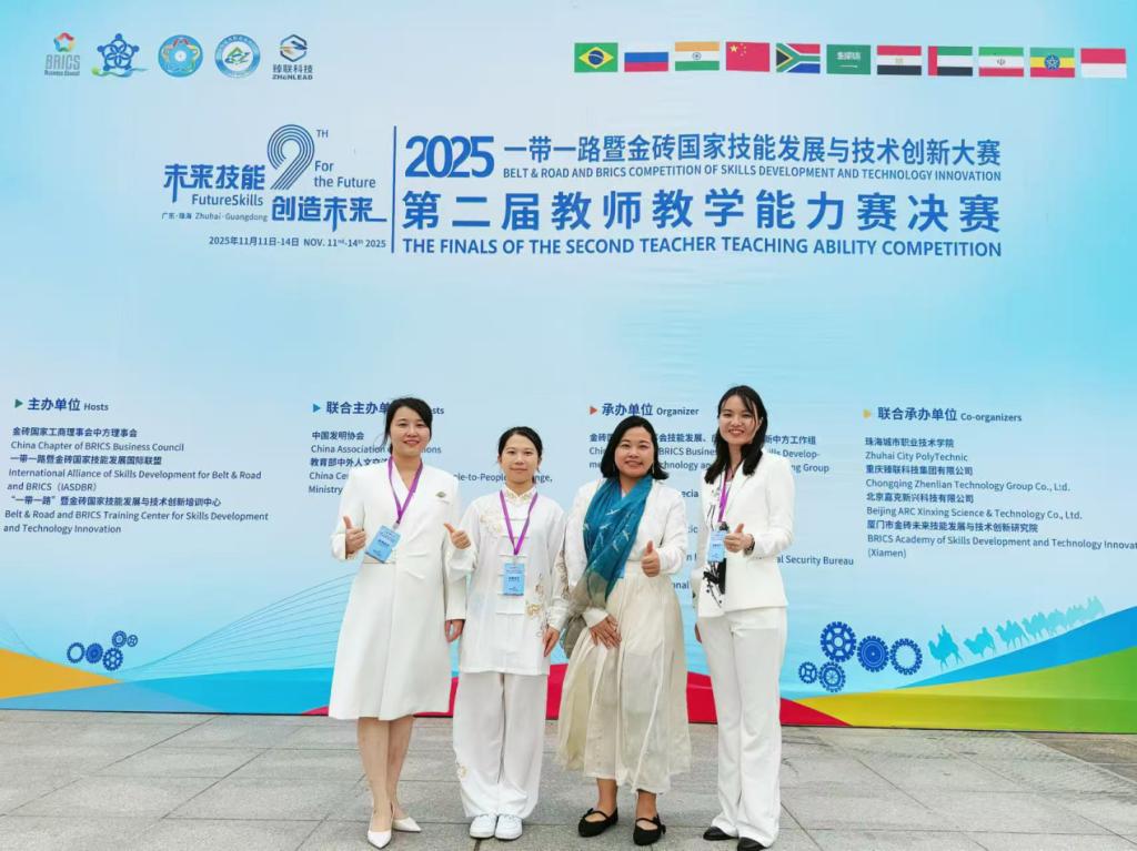 2025年11月14日,2025 一带一路暨金砖国家技能发展与技术创新大赛之第二届教师教学能力赛全国决赛在广东省珠海城市职业技术学院圆满落幕。我校教育与体育学院(筹)社区管理与服务专业刘淑娴、袁美芝、洪明心、刘思老师组成的参赛团队,在社会和个人服务赛道的激烈角逐中表现优异,凭借扎实的教学功底、创新的教学设计和出色的现场展示,最终斩获银奖,充分展现了我校教师的教学风采与专业素养。