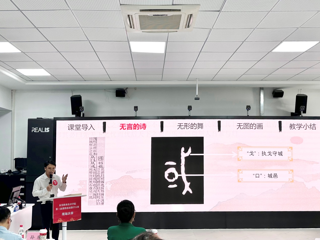 陈嘉豪老师以书法这一中华传统文化瑰宝为载体,课上从道、技、形三个角度展开教学,从道的角度以《何尊》铭文“中国”二字为例,让学生体悟书法深层价值;从技的角度将舞剧动作与书法用笔对照,欣赏无形之舞;从形的角度通过游戏让学生感知书法意境。课后从临摹经典、设计融合、笔墨交流等方面扩展课堂,让学生感受中国传统文化的博大精深和传承发展的重要性,激发学生的文化自信和民族自豪感,使思政教育与书法教学紧密融合,让学生在挥毫泼墨间接受思政的熏陶。