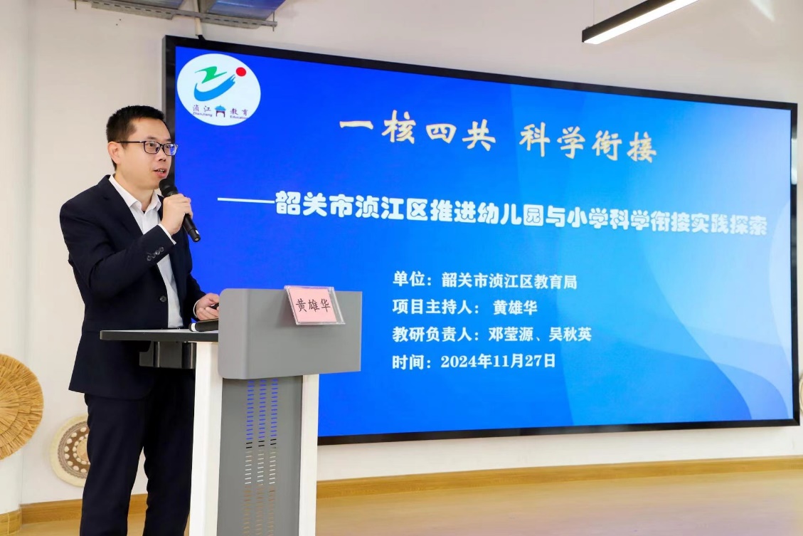 韶关市浈江区教育局党组成员、浈江区教师发展中心主任黄雄华表示,衷心感谢东职院三年来对韶关市浈江区学前教育的大力帮扶,期望借助东职院优质的高校资源和院园合作平台,持续提升韶关市浈江区幼儿教师的知识深度、技能高度和成长效度。随后,他就韶关市浈江区省级幼小科学衔接项目作经验分享。