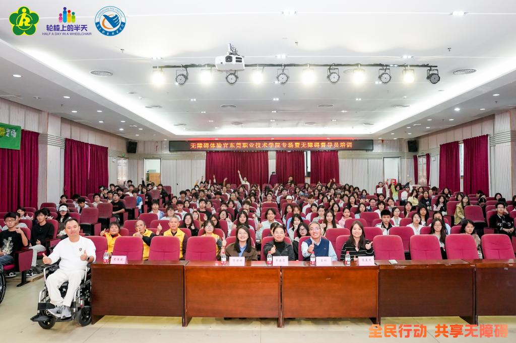 11月23日,东莞市残疾人联合会与东莞职业技术学院共同举办由教育与体育学院社区管理与服务党小组执行的“无障碍与残障文化校园行”活动在东职院松山湖校区举行。活动邀请深圳市龙华区残联理事、残障倡导者吴浩波先生到校开展专题讲座,市残联维权部部长王刚、教育与体育学院院长辛海霞、社区管理与服务专业教师及近200名学生参加。本次活动是学校与市残联深化合作的又一次重要实践,在校园内营造了生动、真实的无障碍教育场景。