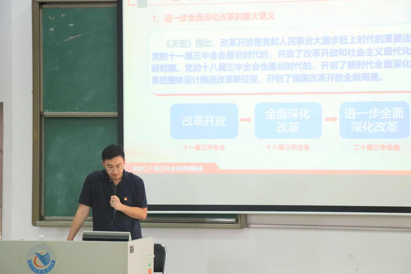 班会中,朱跃东副书记首先回顾改革开放历程,以东莞从农业县到制造业名城的转变为例展现改革开放成就。随后,通过案例分享让同学们讨论东莞变化的原因,接着带领大家学习党的二十届三中全会公报内容,阐释推进中国式现代化的重大意义和总体要求,激励同学们勇做推进中国式现代化的奋进者、开拓者、奉献者,让青春在全面建设社会主义现代化国家的火热实践中绽放光彩。